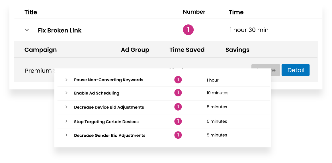 Identify underperforming aspects of your account, reducing inefficient ad spend and improving campaign performance. Examples include fixing a broken link, pausing non-converting keywords, or adjusting your ad bid based on device, location or age-range.