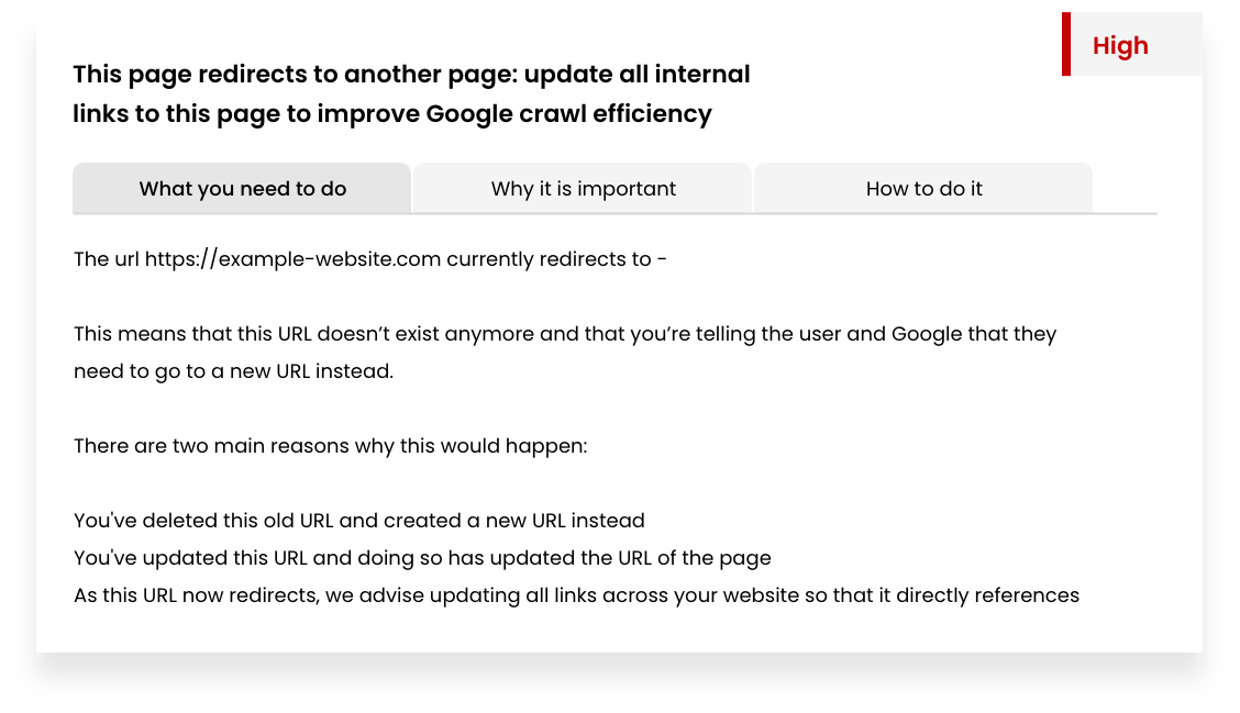 Using a ‘what, why, how’ approach we'll provide actionable optimisation suggestions with full explanations of why they’re important and how to implement them.