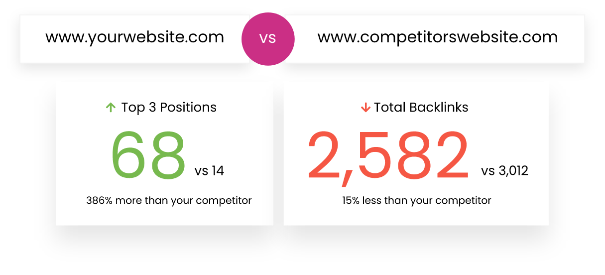 Trying to outrank your main competitor? Your report will show you how you compare on key elements such as keywords, backlinks, and more. Run new reports every week and track your progress.